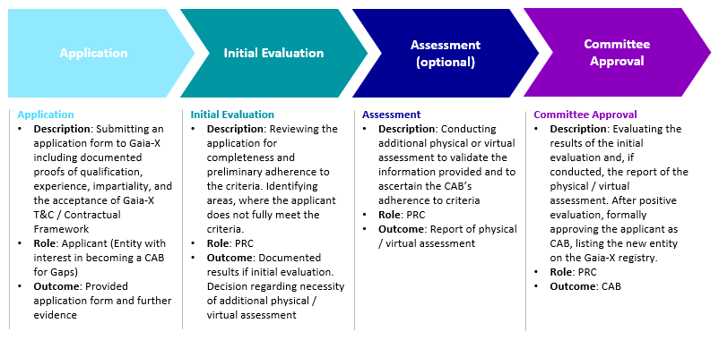 Entities, interested in becoming an approved/listed CAB for Gaia-X Labelling, submit an application form to Gaia-X AISBL including documented proofs of applicable criteria (e.g. qualification, experience, and impartiality).
