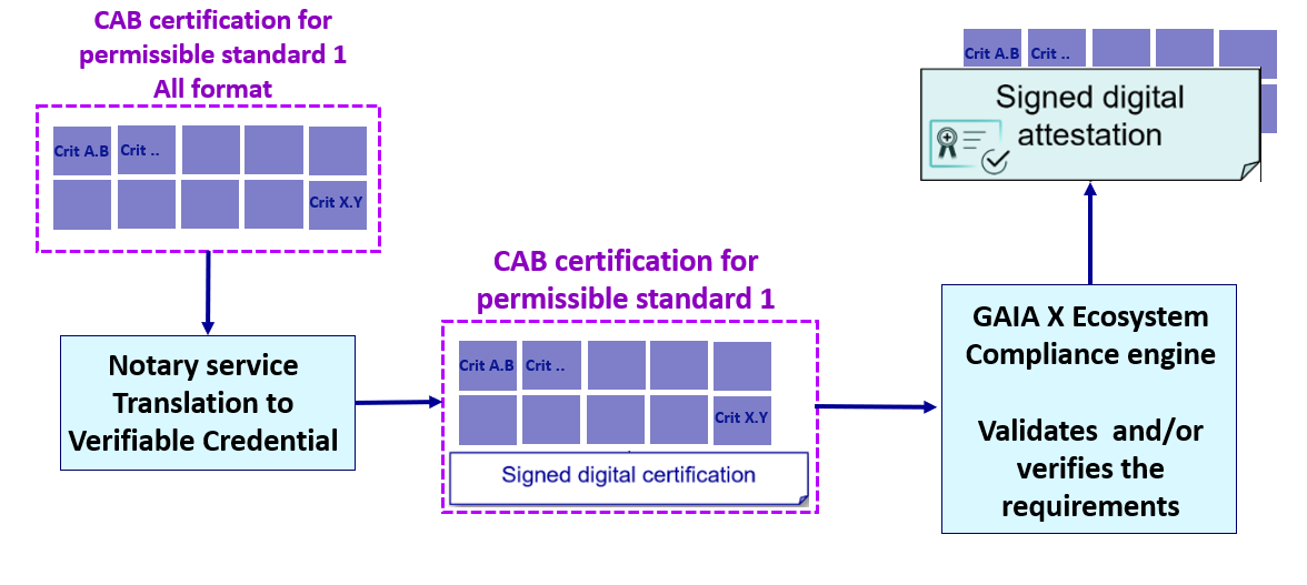 CAB certifications issued by a CAB listed in the GAIA X Registry can be used to validate all criterions fully compliant covered by CAB certificate’s perimeter as described in this document.