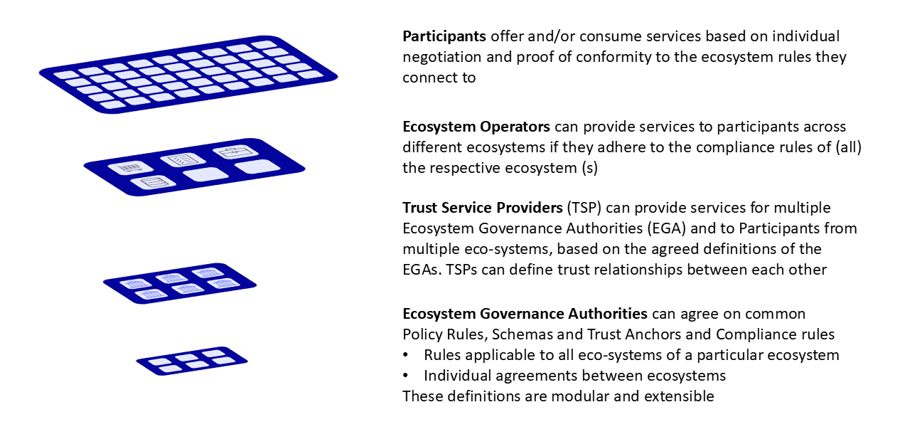Ecosystems then become interoperable because they (a) use the same language for specifying their trust model and (b) by agreeing on a common set of trusted ecosystem services for those (few) services both deem relevant for becoming interoperable, for instance, agreeing on a set of mutually accepted identity providers, notaries, or conformity assessment bodies.