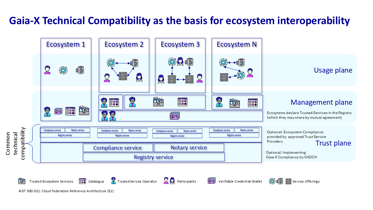 Figure 3.3.4 features a Trust Plane (at the bottom) common to all ecosystems comprising two distinct features: 1. Technical compatibility: A mechanism by how ecosystems specify their particular notions of trust, for instance, which identity providers or catalogues to trust. Technically, this amounts to defining,