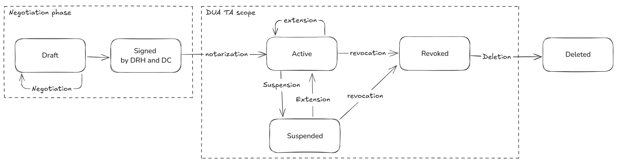 Revoked | Both DRH and DC can revoke a DUA: the DRH can revoke to enforce their data sovereignty, and the DC to get proof that they did not access the data after a specific date (without having to activate access logs). |