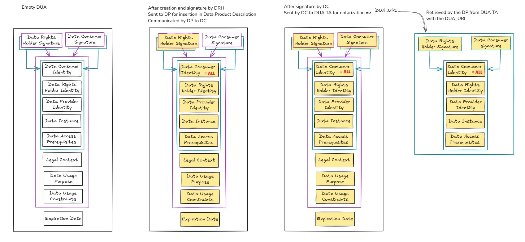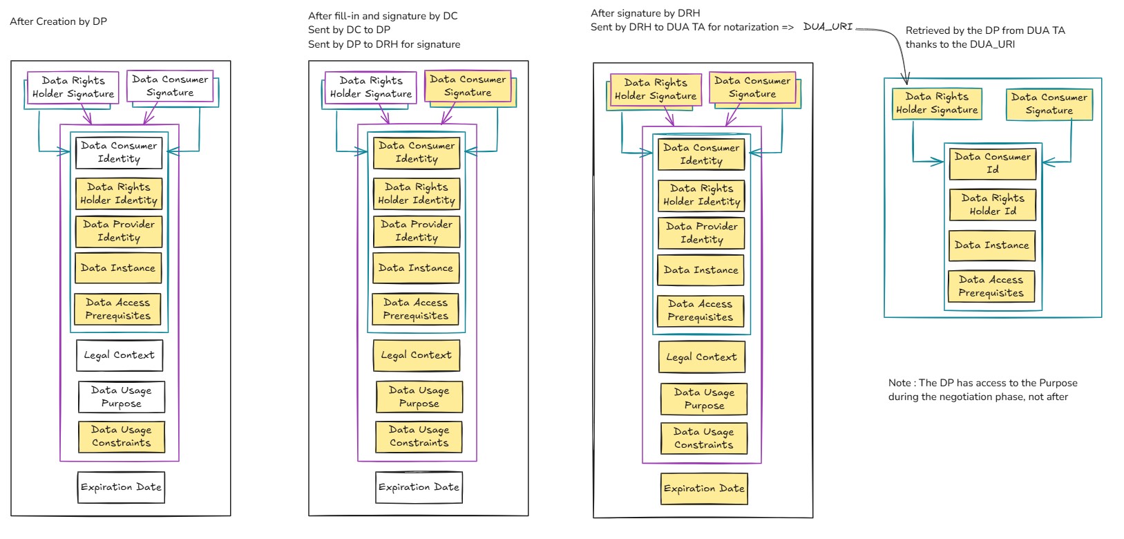 To adapt to the various use cases identified in the Gaia-X data sharing model, there are no constraints related to the way in which the DUA field is agreed upon by the DRH and DC and in what order the DUA is signed.