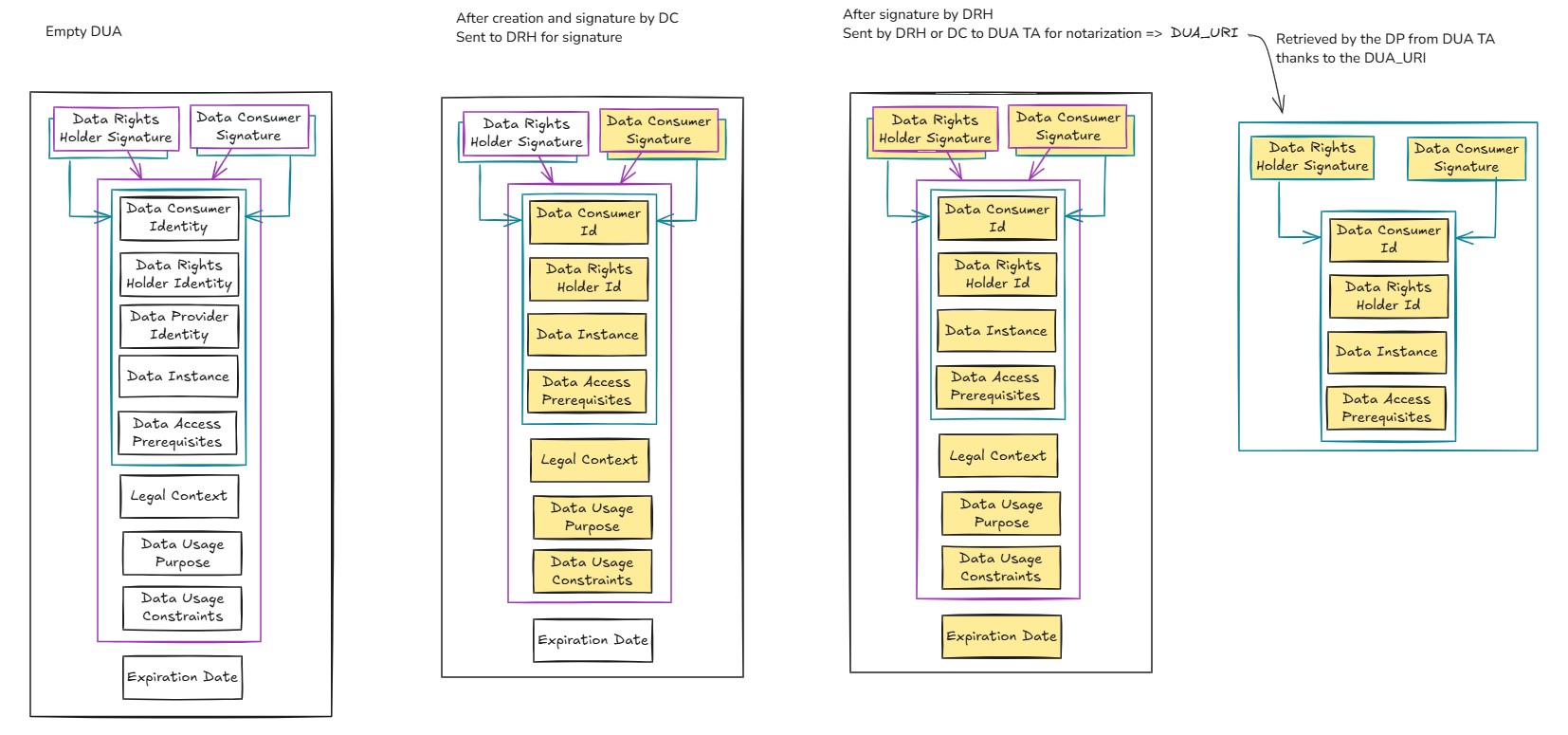 To adapt to the various use cases identified in the Gaia-X data sharing model, there are no constraints related to the way in which the DUA field is agreed upon by the DRH and DC and in what order the DUA is signed.